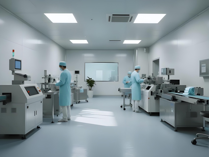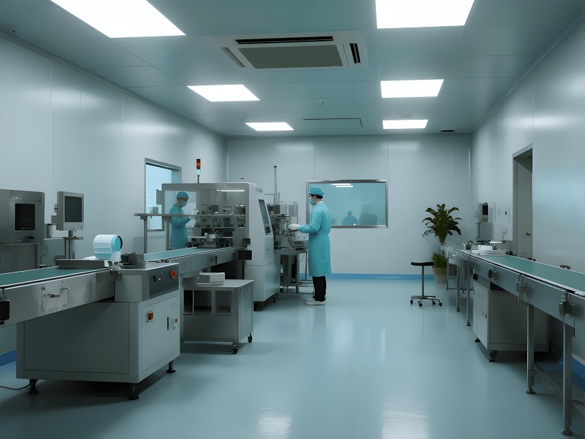本潔凈車間設計采用現代工業極簡風格,強調功能性與潔凈度。主色調選用淺灰藍(墻面)與純白(頂面)的搭配,營造冷靜專業的氛圍,局部用淡綠色做視覺緩沖。