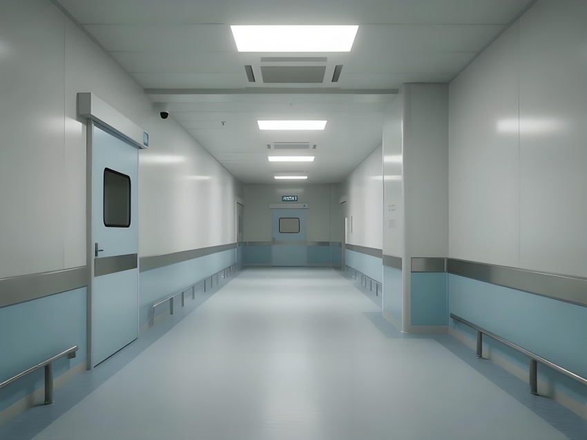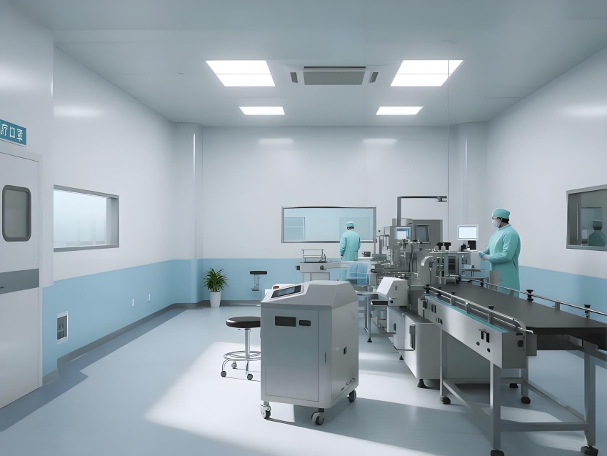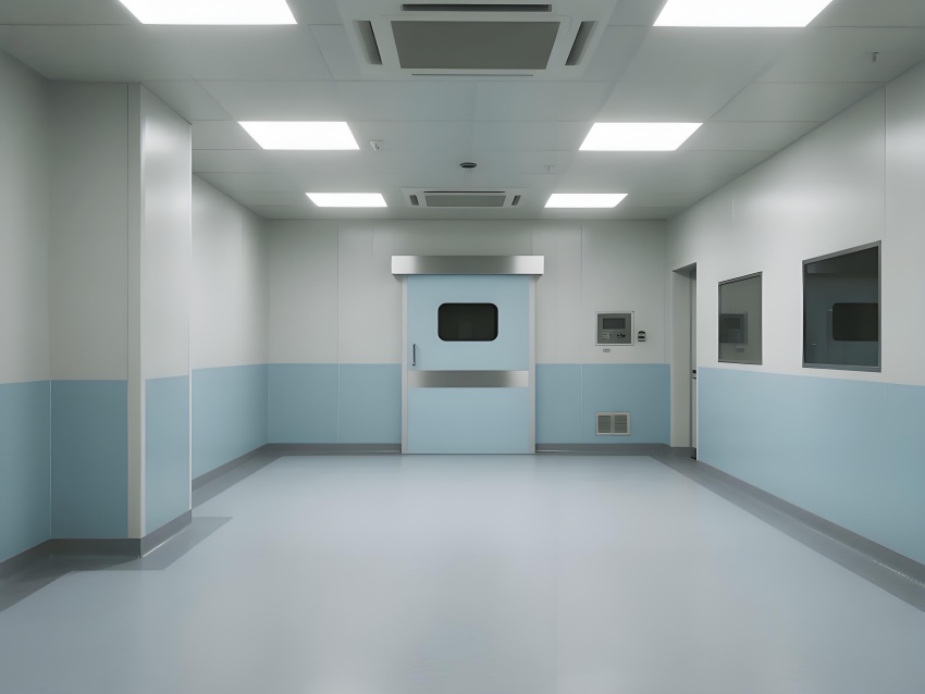地面采用防靜電環氧自流平,耐磨無縫隙且易清潔;墻面為50mm厚抗菌彩鋼板,圓弧角處理避免積塵;頂面配置一體化鋁扣板吊頂,內置FFU空氣過濾單元,與LED平板燈形成均勻照明。