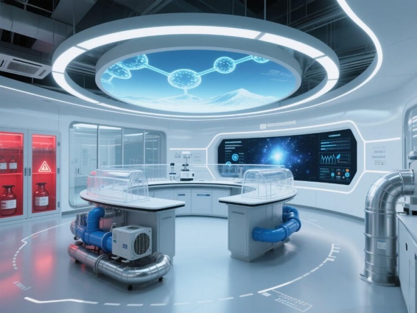 本實驗室以"絕對環境控制"為核心設計理念,整體采用冰川藍與鈦白灰的漸變配色。墻面嵌入式環境參數監測屏實時流動著翡翠綠數據流,與頂棚矩陣排列的微孔送風口形成科技韻律。核心實驗區采用圓弧形防結露玻璃隔斷,內置百級潔凈層流罩。地面鋪設防靜電陶瓷鋼板,接縫處嵌入LED環境達標指示燈。設備區裸露的銀色保溫管道與藍色冷媒管構成工業美學展陳,智能除濕機組通過半透明外殼展示內部冷凝過程。數據中控室配備270°曲面監控屏,懸浮粒子濃度以動態星云圖呈現。空間通過嚴謹的幾何分割與流體力學曲線結合,在極致環境控制要求下,打造出兼具科研嚴肅性與星際艙未來感的頂級實驗環境。