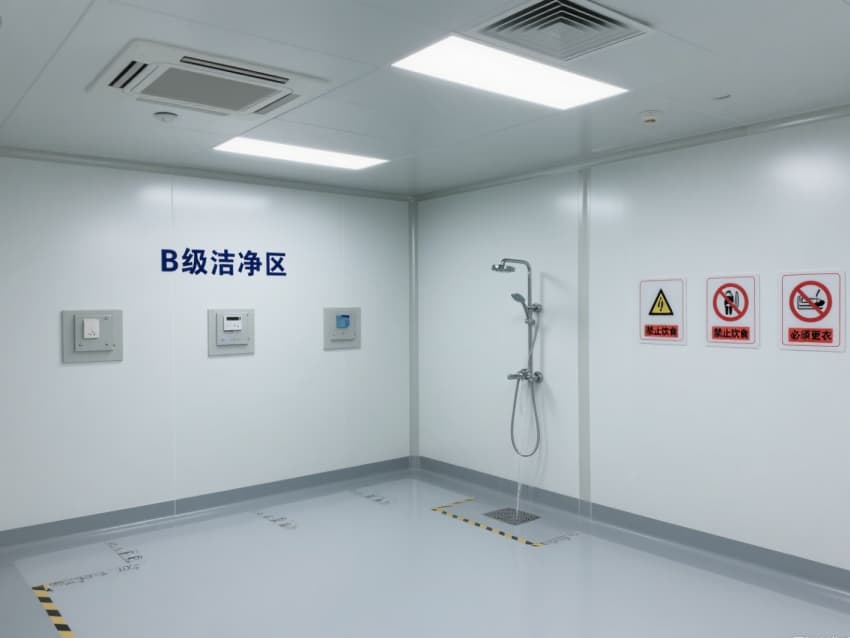 車間嚴格遵循萬級潔凈標準,每立方米空氣中≥0.5μm微粒數≤35.2萬個、菌落數≤10個。白色抗菌彩鋼板搭建的墻體與吊頂,具備抗菌、耐腐蝕、易消毒特性,墻面與地面的圓弧過渡設計徹底消除衛生死角;淺灰防靜電環氧地坪則通過防靜電處理,避免靜電干擾生物活性物質。?