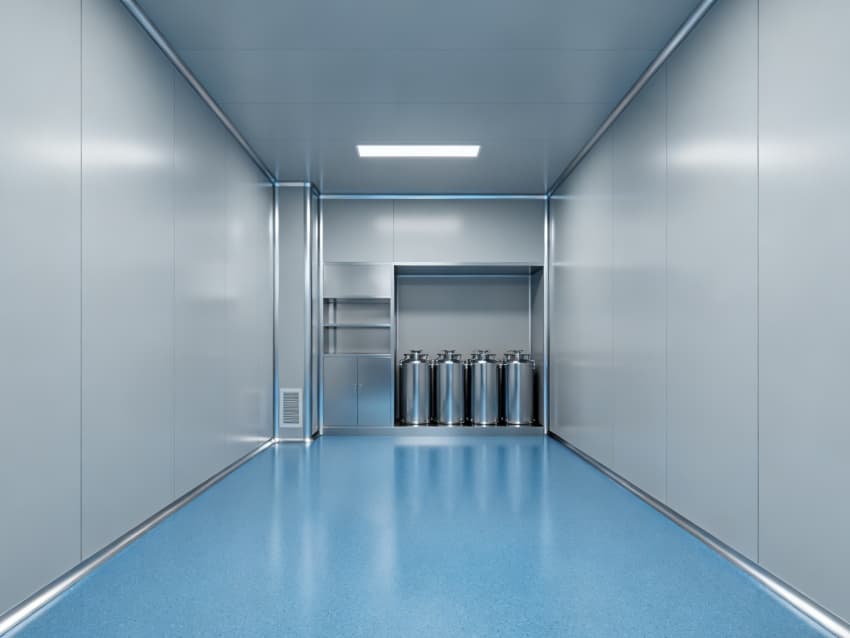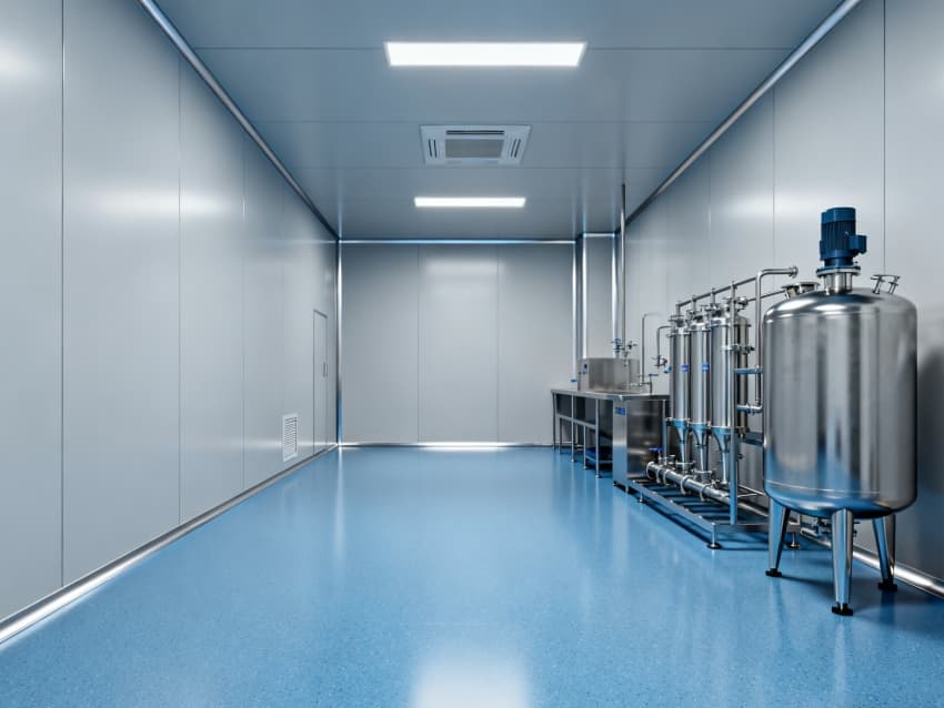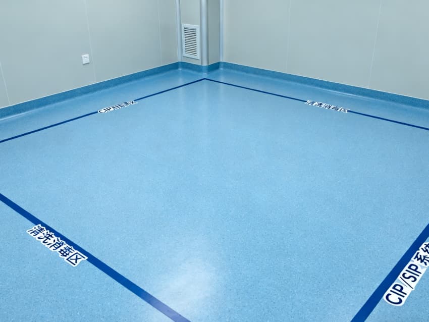 設計在環境防護上針對性突出:地面采用藍色耐腐環氧材質,可耐受酸堿類藥劑侵蝕,且無縫拼接設計便于清潔消毒;四周淺灰色抗菌墻壁采用防霉涂層處理,配合圓弧墻角結構,避免藥液殘留與粉塵堆積,搭配頂部層流送風系統,能穩定維持萬級潔凈度,滿足藥劑配液對微環境無菌性的嚴苛要求。