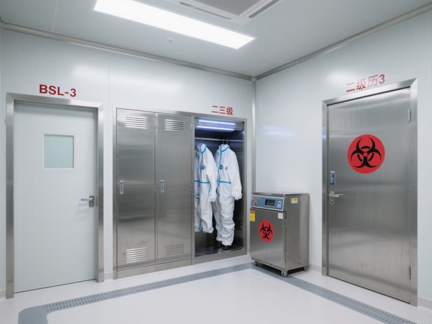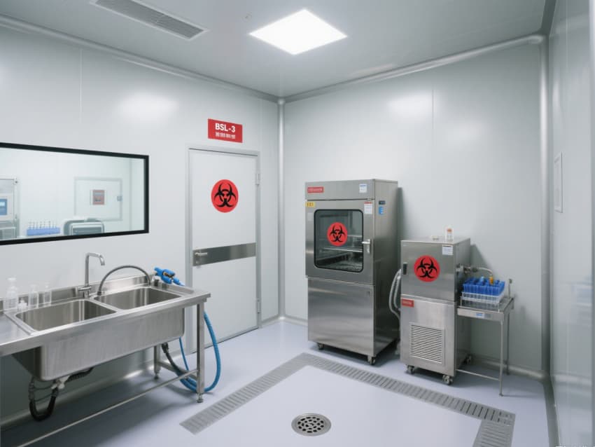 病原微生物實驗室是開展危險微生物研究的核心場所,嚴(yán)格遵循BSL-2/3級生物安全標(biāo)準(zhǔn),構(gòu)建多層防護體系。整體以灰白色抗菌彩鋼板打造密閉墻體與吊頂,搭配淺灰色防滑防腐地坪,墻面紅色生物危害標(biāo)識與藍(lán)色功能分區(qū)線清晰劃分,強化安全警示與流程引導(dǎo)。?