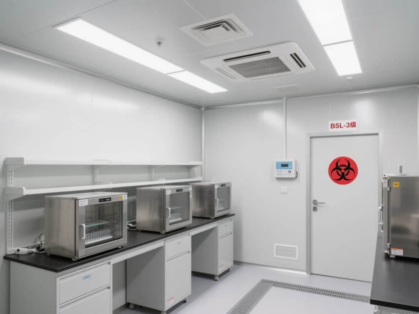 實驗室核心區(qū)域配備負(fù)壓生物安全柜、雙扉高壓滅菌器,確保微生物操作與廢棄物處理安全;頂部高效空氣過濾器(HEPA)實現(xiàn)每小時15-20次空氣置換,尾氣經(jīng)消毒處理后排放,避免氣溶膠擴散。互鎖式潔凈門、雙層鋼化玻璃觀察窗與應(yīng)急噴淋裝置,形成全流程安全保障。?