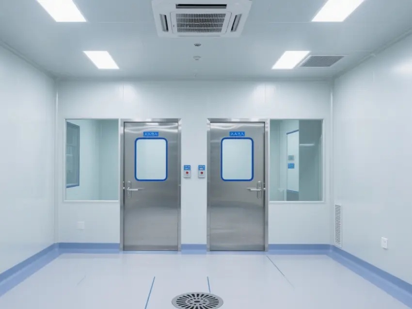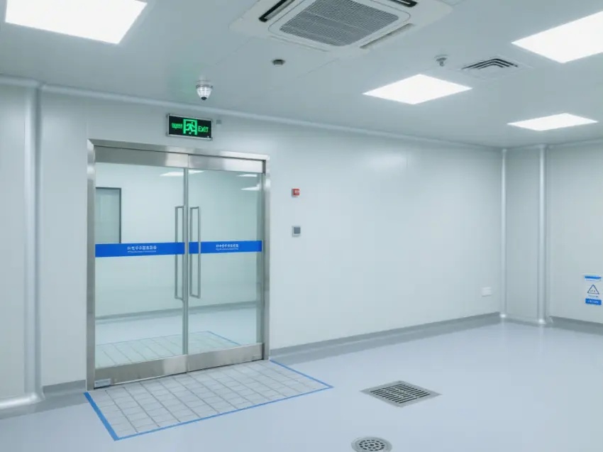 車間的天花板上安裝了多個方形的照明燈,提供充足的光線,同時還有通風設備,確保空氣流通,保持車間內的空氣潔凈度達到萬級標準。墻壁上有一些玻璃窗戶和門,便于觀察內部情況。