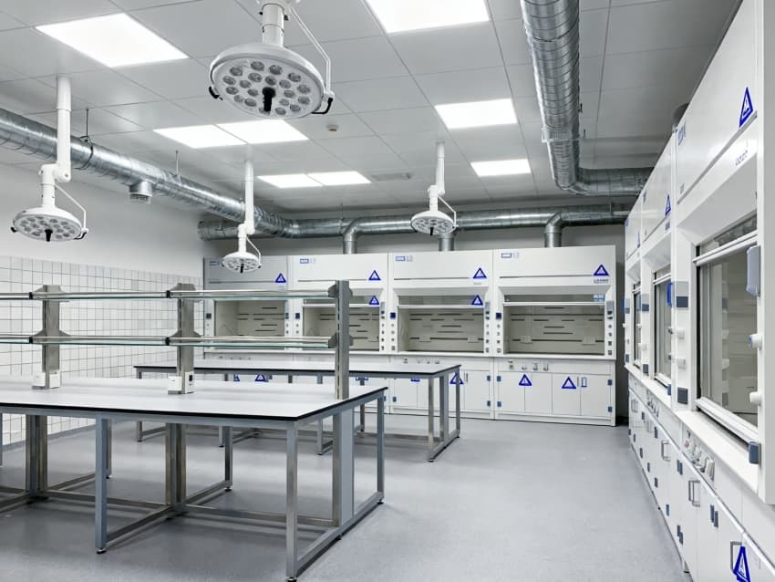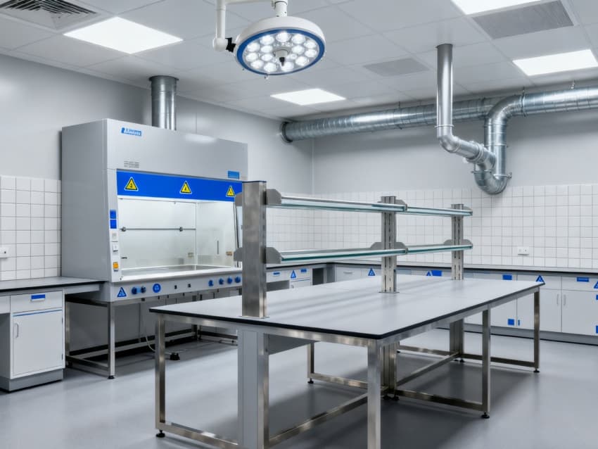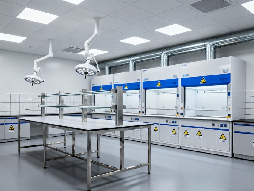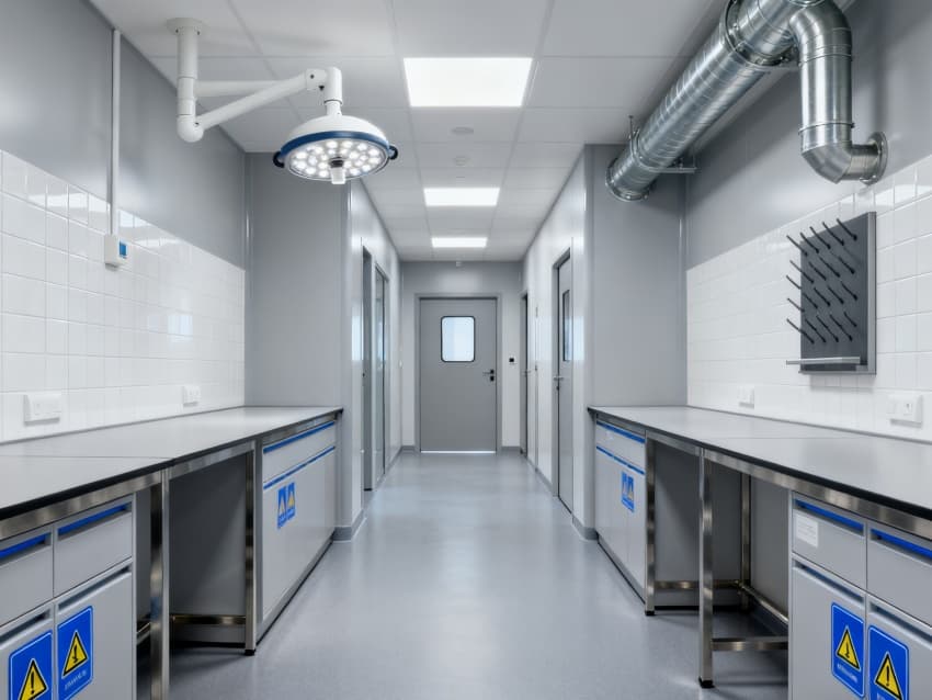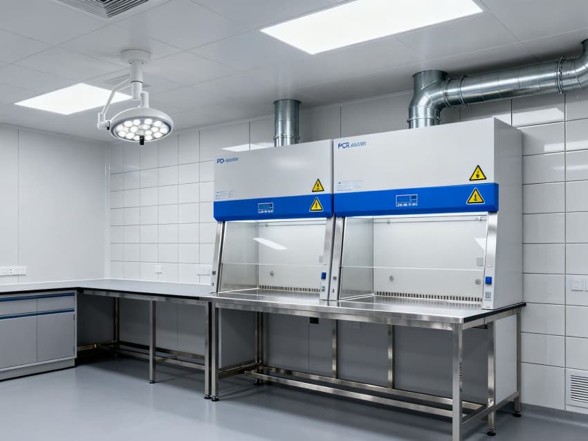 潔凈度執(zhí)行分級(jí)標(biāo)準(zhǔn):核心操作區(qū)達(dá)萬(wàn)級(jí)(ISO8級(jí)),每立方米空氣中≥0.5μm微粒≤352000個(gè);輔助區(qū)域?yàn)槭f(wàn)級(jí)(ISO9級(jí)),通過(guò)初效-中效-高效三級(jí)空氣過(guò)濾系統(tǒng),配合側(cè)送頂回氣流設(shè)計(jì),實(shí)現(xiàn)每小時(shí)18-22次空氣置換。墻面采用耐酸堿潔凈彩鋼板,地面為防滑PVC無(wú)菌卷材,所有接縫密封處理;溫度穩(wěn)定在22±2℃,濕度控制在45%-55%,關(guān)鍵區(qū)域維持微負(fù)壓,有效避免試劑交叉污染與有害氣體擴(kuò)散,完全符合生化實(shí)驗(yàn)室建設(shè)規(guī)范。
