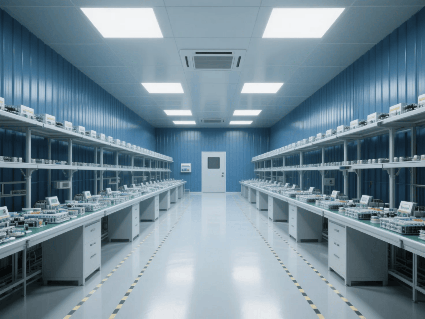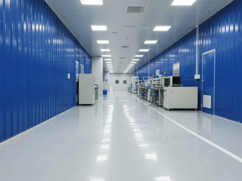 本工程嚴格遵循ISO14644-1Class8標準,采用"工業(yè)科技風"設(shè)計理念,打造現(xiàn)代化電子零件制造環(huán)境。車間以深藍彩鋼板墻體與淺灰防靜電環(huán)氧地坪形成鮮明視覺對比,營造兼具科技感與功能性的生產(chǎn)空間。