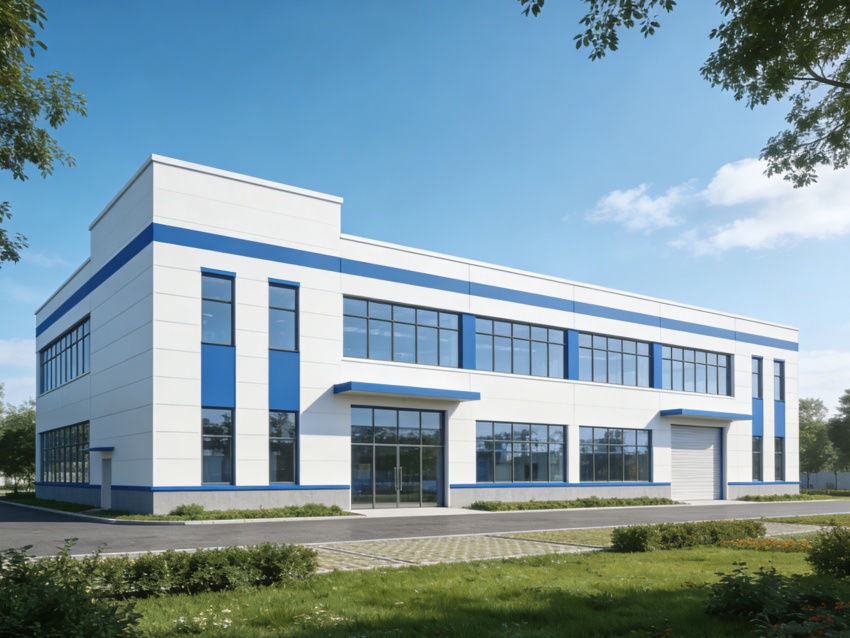 本次呈現的廠房電子光學車間,整體風格簡約專業,精準匹配電子光學器件研發與生產的核心需求。廠房外立面采用淺灰色工業基材搭配大面積高透玻璃幕墻,既保障建筑密封性與隔音性,又為內部車間引入充足自然光,外觀簡潔大氣且兼具工業質感與科技感。均以藍色防靜電潔凈地坪搭配白色無縫潔凈墻面。藍色地面選用高耐磨環氧材質,具備10?-10?Ω防靜電性能,可有效規避靜電對光學元件的損害,表面啞光處理減少光線反射;白色墻面采用環保抗菌涂層,無縫拼接設計消除清潔死角,搭配嵌入式防眩光照明,營造穩定的視覺環境。