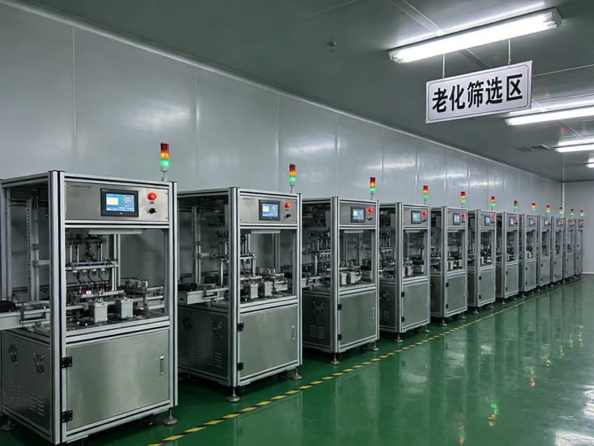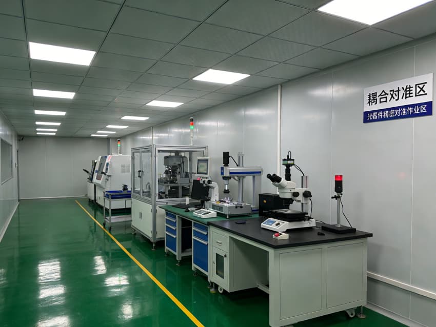 - 核心生產(chǎn)區(qū)以黃色警示線明確人車動線,SMT 貼片工位配備防靜電工作臺與遮光防塵罩,保障貼裝精度;“耦合對準(zhǔn)區(qū)” 采用防震型實(shí)驗(yàn)臺與光學(xué)級照明,搭配密閉玻璃隔斷,為光器件微米級對準(zhǔn)作業(yè)提供穩(wěn)定、潔凈的操作環(huán)境。